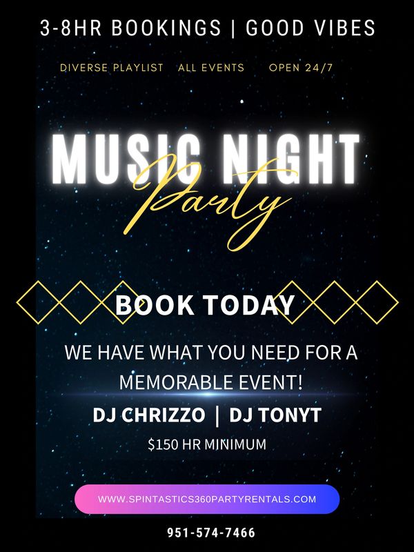 Vibe all night long to one of the greatest DJs in the Inland Empire. We love providing our clients with top notch DJ services to get the party started and provide your guests with hours of electrifying entertainment. We pride ourselves on offering you professional services and endless musical possibilities the Spintastics360 way to make your next event truly memorable.